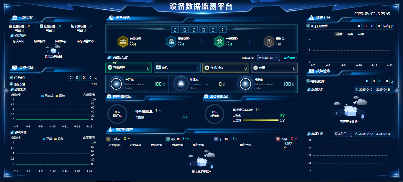 1.档案数字化:记录设备静态信息(型号、规格、制造商、安装日期、技术参数等),支持文档(说明书、合格证、图纸)上传与关联。