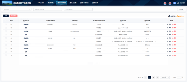 根据不同分类创建多个检查标准库,可自主维护检查标准库。针对不同检查对象设置不同检查标准,针对单条检查标准可以设置检查部位、检查类别、检查方式、是否需要进行拍照、是否需要填写数据、内容功能。针对数据型检查标准,具备输入上限、下限等合理数据区间的功能,在检查中数据不在合理区间时自动判定为异常。